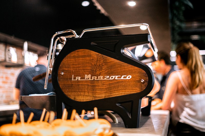 Dans le quartier Wynwood de Miami, le premier site américain de la société basée à Buenos Aires a ouvert ses portes avec des sols en bois, des murs en briques et un bar en béton, surmonté d’une machine à expresso La Marzocco Strada noire avec des panneaux latéraux en bois.